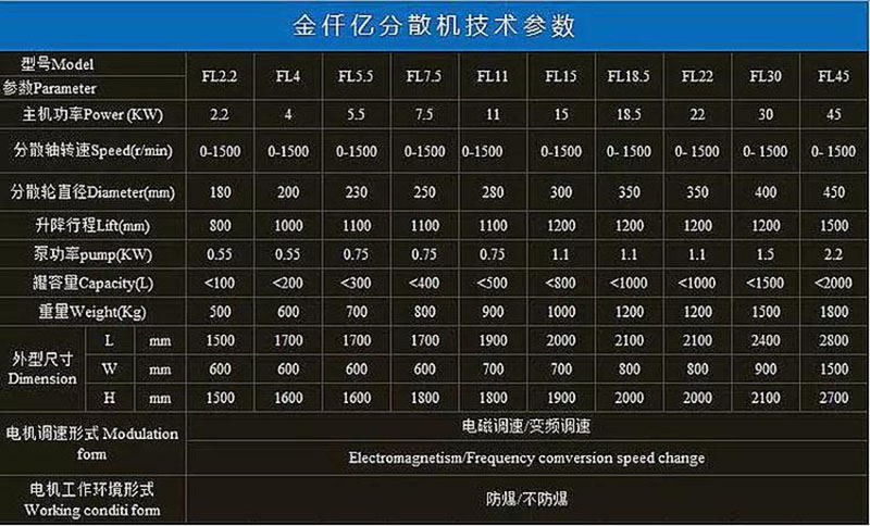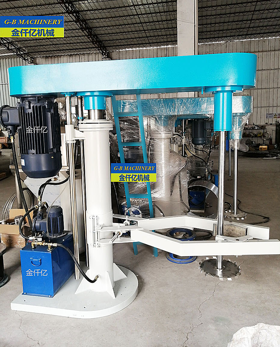 該機由液壓系統(tǒng)、主傳動、攪拌系統(tǒng)、導向機構、電控箱五部分組成,各部分結(jié)構緊湊、合理。分散盤型式:平盤鋸齒式。