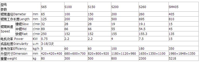 該機通過機器水平方向排列的三根輥筒表面相互擠軋及不同速度的磨擦而達到研磨作用,研磨物料一般只要研磨二次就可以達到要求,難研磨物料必須研磨多次,方能達到要求,加工細度一般可達到3~18微米左右 。